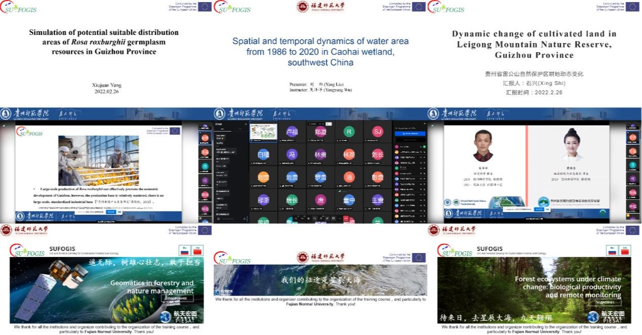 为了提高国际交流合作水平,2022年2月14-日26日(北京时间),贵州山地研究院罗光杰教授、贵州省流域地理国情监测重点实验室吴洋洋、樊瑞雪副教授等带领德赢官网Vwin20余名同学参加了由福建师范大学承办的欧盟合作项目GIS And Remote Sensing For Sustainable Forestry And Ecology(SUFOGIS)冬季学校,限于疫情防控需要,本次冬季培训采用线上会议方式开展。参加此次会议的有中国、俄罗斯、欧盟等国内外专家学者与高校学生。本次活动得到欧盟ERAMUS+ SUFOGIS项目(598838-EPP-1-2018-EL-EPPKA2-CBHE-JP)的资助。