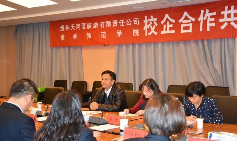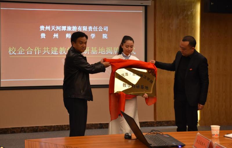 11月2日,德赢官网Vwin地理与旅游学院院长李乐京教授、学院李倩副教授、罗清云老师、费雄老师一行四人赴天河潭景区参加“德赢官网Vwin与贵州天河潭旅游有限责任公司共建校企合作基地”揭牌仪式,并洽谈校企合作相关事宜。天河潭旅游有限责任公司的王兼总经理、马骏驰副总经理、人事经理罗小静及其相关部门负责人出席了揭牌仪式。