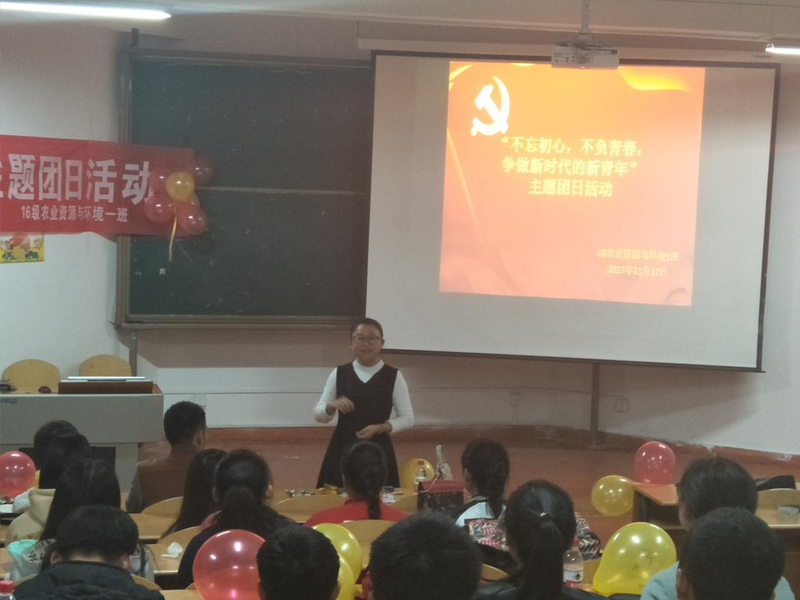此次主题团日活动于11月17日晚上6点正式开始,由16农业资源与环境1班团支书徐倩主持此次活动。首先同学们观看了《党的第十九次全国代表大会报告全文》的相关视频,同学们在认真仔细观看后,深刻学习领会到中国特色社会主义新时代的新论新、我国社会主要矛盾发生的新特点、分两步走全面建设社会现代化国家的新目标及党的建设的新要求的具体内容。随后,同学们根据自己对十九大精神的理解进行自由发言,很多同学根据自己家乡近几年的变化,阐述了自己对于十九大精神的理解。最后周光红老师针对本次“不忘青春,不负青春,争做新时代的新青年”团日活动主题发表了讲话,她首先回顾了一下党的发展历史,然后结合自身的经验,及对党的认识,让大家充分认识到学习和贯彻党的十九大报告精神的重大意义,应该做到切实把思想和行动统一到习近平总书记重要讲话精神上,奋力开启新征程,实现新跨越,谱写新篇章。同时也对同学进行了寄语:青年树立什么样的人生理想,选择什么样的奋斗方向,对于走好一生的路至关重要。让我们深刻理解作为青年一代应该担负的历史使命,用伟大的中国梦激扬青春梦、努力成为“有理想、有本领、有当但”的优秀青年。本次活动在同学们的掌声中取得全满的成功。
