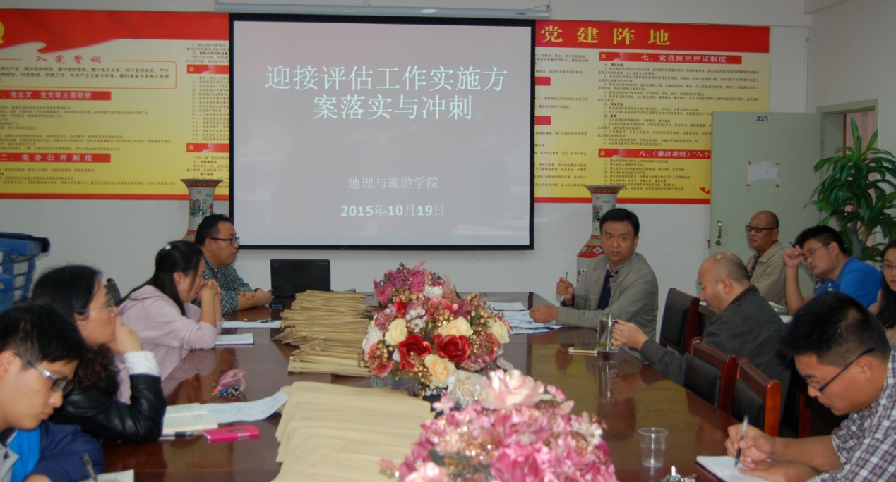2015年10月19日中午1点,地理与旅游学院院长李乐京主持召开德赢官网迎接评估工作方案的落实与冲刺会议,迎评方案涉及的全体人员参与了会议。