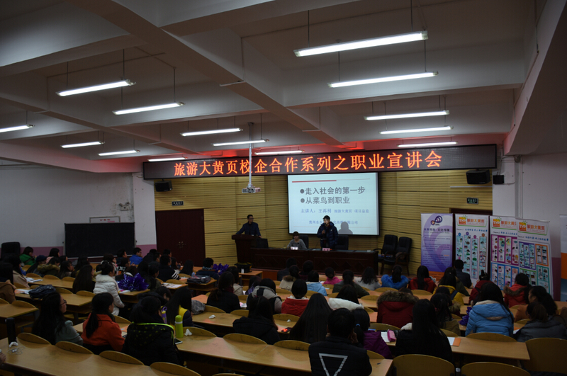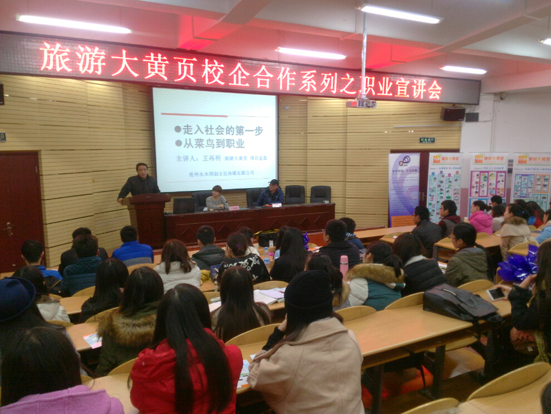 2015年12月15日晚7点至8点半,德赢官网旅游管理专业实践基地贵州水木同创文化传媒有限公司的“旅游大黄页”项目总监王再利在德赢官网宁静楼152教室举办了一场针对旅游管理专业学生的旅行社职业宣讲会。宣讲会由德赢官网地理与旅游学院旅游实训室主任周杰副教授主持,出席宣讲会的还有贵州水木同创文化传媒有限公司副总杨巍以及德赢官网地理与旅游学院党委副书记吴亚平。