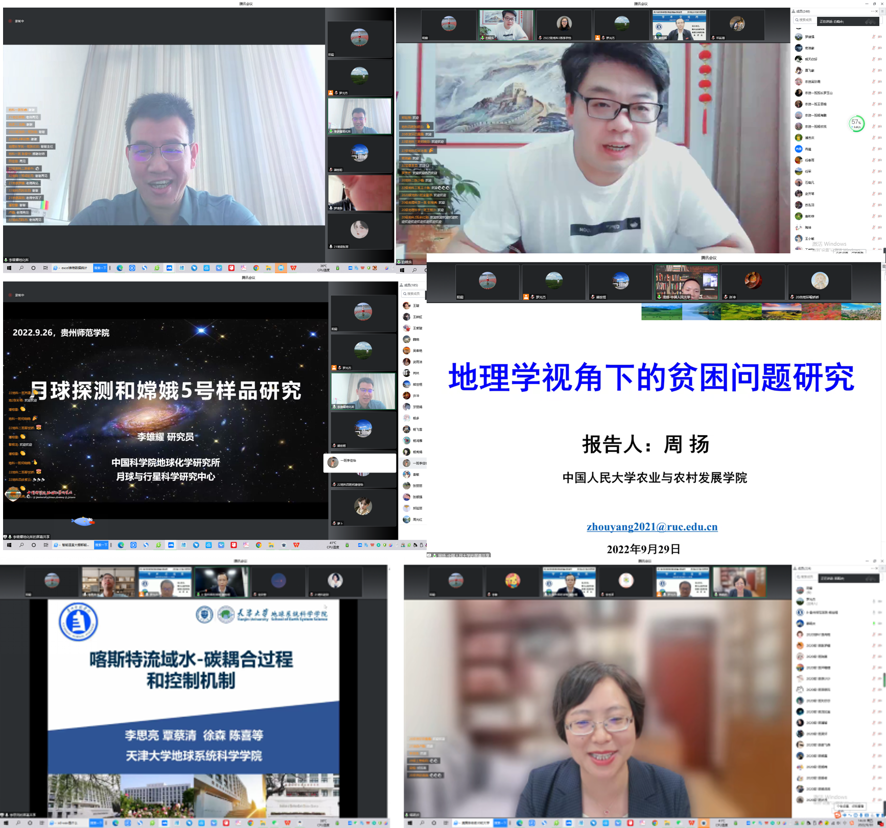 本次交流周共邀请来自中国科学院、复旦大学、中国人民大学等科研院所和高校专家学者进行了6场专题学术报告。中国科学院地球化学研究所研究员,博士研究生导师,月球与行星科学研究中心主任李雄耀作了题为《月球探测和嫦娥五号样品研究》的专题报告;中国科学院地球化学研究所研究员,博士研究生导师,生态环境与资源利用中心主任白晓永作了题为《喀斯特生态安全与贵州碳中和能力诊断》的专题报告;美国NASA研究科学家,德赢官网特聘教授李爽作了题为《地球科学大数据高性能计算的现状与展望》的专题报告;中国人民大学副教授,博士生导师周扬作了题为《地理学视角下的贫困问题研究》的专题报告;国家杰出青年科学基金和优秀青年科学基金项目获得者,天津大学教授,博士研究生导师李思亮作了题为《喀斯特流域水-碳耦合过程和控制机制》的专题报告;复旦大学历史地理研究所教授,博士研究生导师韩昭庆作了题为《历史时期玉米种植与贵州石漠化变迁的关系》的专题报告。