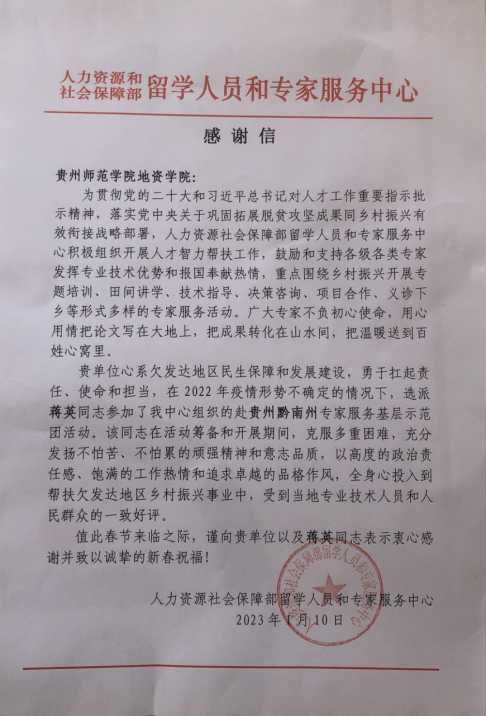 为贯彻党的二十大和习近平总书记对人才工作重要指示批示精神,落实党中央关于巩固拓展脱贫攻坚成果同乡村振兴有效衔接战略部署,在2022年疫情形势不确定的情况下,德赢官网Vwin蒋英同志受邀参加了人力资源社会保障部留学人员和专家服务中心组织的赴贵州黔南州专家服务基层示范团活动。 蒋英同志在活动筹备和开展期间,克服多重困难,充分发扬不怕苦、不怕累的顽强精神和意志品质,以高度的政治责任感、饱满的工作热情和追求卓越的品格作风,全身心投入到帮扶欠发达地区乡村振兴事业中,受到当地专业技术人员和人民群众的一致好评,并收到人力资源社会保障部留学人员和专家服务中心专信致谢。