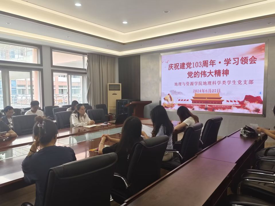 为隆重庆祝中国共产党成立103周年,进一步学习和领会党的伟大精神,深化对党的历史认识,激发爱国情怀。2024年6月27日,德赢官网Vwin地理科学类学生党支部在宁静楼323会议室开展了“庆祝建党103周年·学习领会党的伟大精神”主题活动。