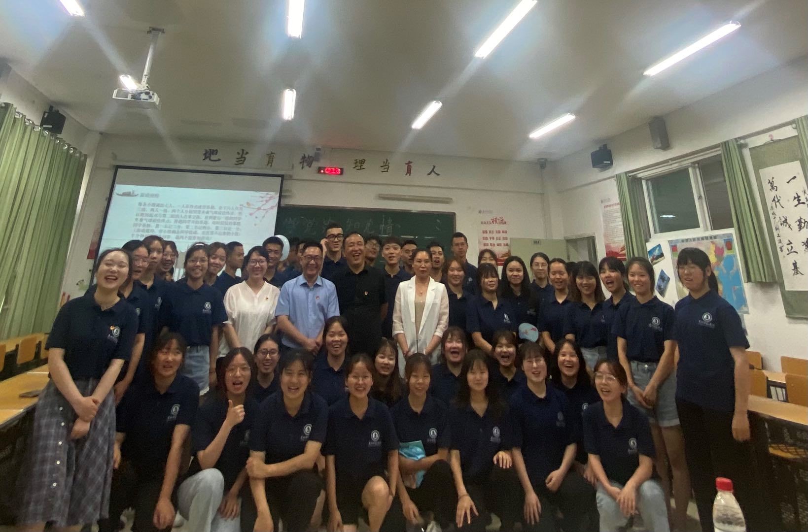 魏昱冰以播放革命历史题材电视剧《觉醒年代》片段的方式引出此次团日活动主题,同时引导同学们应不忘初心、、砥砺前行。随即,魏昱冰通过组织各小组之间的党徽坚持理想信念绘画比赛、唱红歌、讲革命故事、现场党史竞答四个小游戏来分享各小组党史学习的心得体会。游戏结束后,魏昱冰总结了此次团日活动并为游戏获胜的小组颁发礼物,同学们交流讨论后发表了对本次团日活动的感想。紧接着,吴亚平和罗绪强分别上台发言。他们强调,中国人民如今惬意和平的生活离不开中国共产党的奋斗,我们应心存感恩、饮水思源,发展好自己,为国家进一步的富强添砖加瓦。最后,魏昱冰在感谢了老师们的赠言后宣布了本次团日活动的结束。各学院领导与本次活动承办的团支部进行了合照。