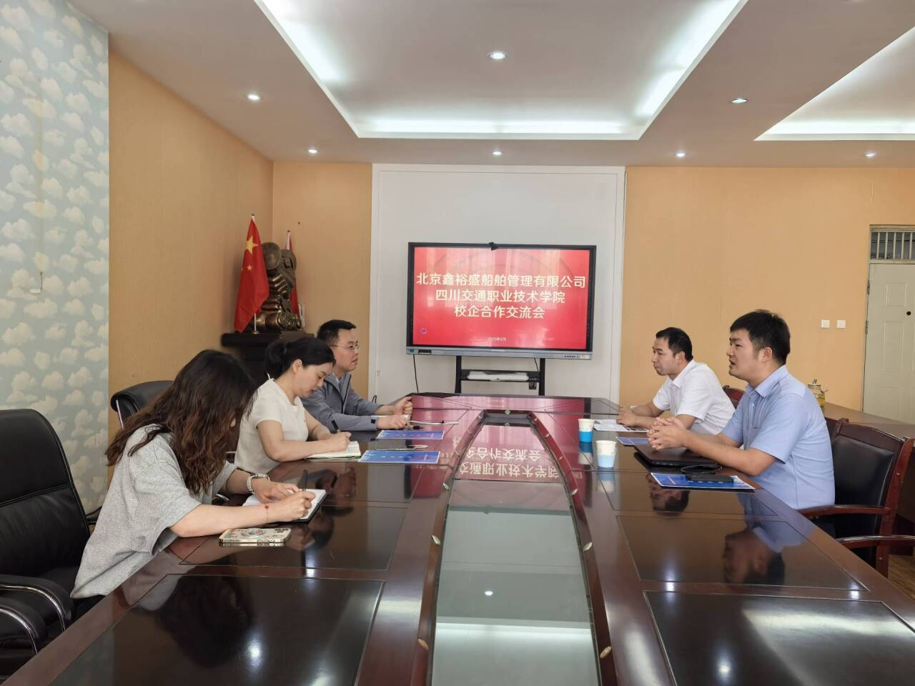 近日,北京鑫裕盛船舶管理有限公司招募部副经理夏涛、外派事业部主管赵方杰到校与航运工程系开展校企合作交流会,系党总支书记刘英、副主任唐德才以及就业干事刘怡参与座谈。
